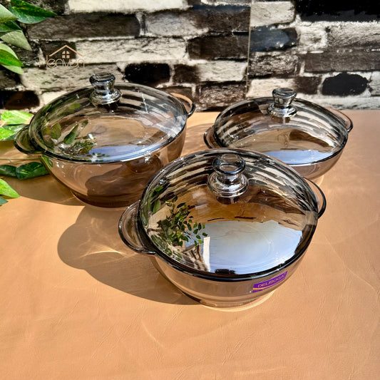 Delisoga® 3-Piece Smoke Grey Round Tempered Glass Bakeware Bowl Set with Lids Food Storage Containers - EB100/L3HS