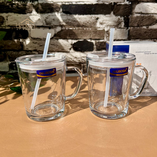 Delisoga® Set of 2 Transparent Coffee Mugs with Straw -Premium Mason Jar 400 ML
